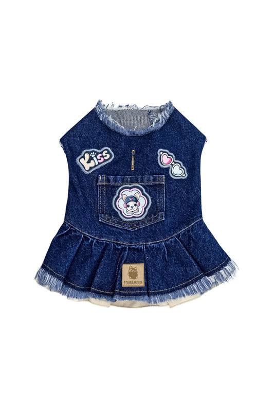 FOURAMOUR Bej Etekli Koyu Yıkama Denim Köpek Elbisesi “Kiss”