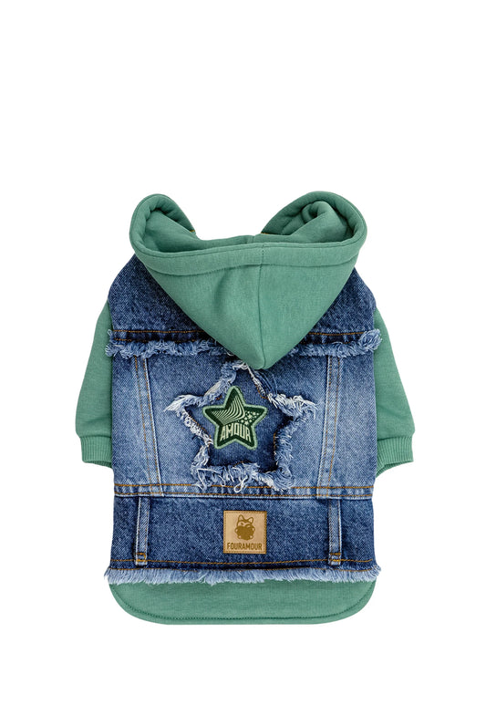 FOURAMOUR Su Yeşili Kapüşonlu Köpek Denim Ceketi